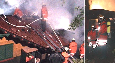 Brand im Ferienhausgebiet Friedrichsdorf (Fotos:Richter)(hr) Beträchtlicher Sachschaden entstand heute morgen gegen 6 Uhr bei einem Brand in der Ringstraße in Friedrichsdorf. Neben einem Ferienhaus ging ein Geräteschuppen in Flammen auf. Das Feuer sprang zunächst auf einen überdachten Holzstapel und dann auf das Ferienhaus selbst über. Der Besitzer des Hauses bemerkte den Brand und alarmierte die Feuerwehr Eberbach. Deren Abteilungen Friedrichsdorf und Stadt konnten ein vollständiges Abbrennen des Hauses verhindern. Ob das Feuer von einem Ofen in dem Geräteschuppen ausging, ist derzeit noch unklar. Die Polizei ermittelt noch zur Brandursache.