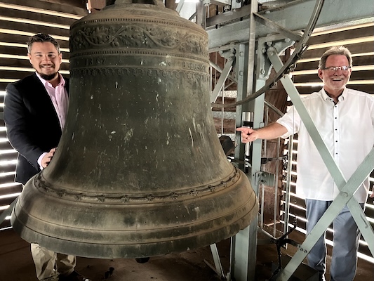 Ein Fest des Klangs und der Erinnerung Die Christusglocke, welche die Beerfelder Pfarrer Roland Bahre (l.) und Roger Frohmuth hier einrahmen, ist die größte und schwerste der fünf Glocken im Turm der Martinskirche. Sie überstand den Krieg und kehrte bereits 1947 auf ihren angestammten Platz zurück. Vor genau 75 Jahren wurden sie in Dienst gestellt – und darum wird nun in Beerfelden Glockenjubiläum gefeiert. (Bernhard Bergmann)