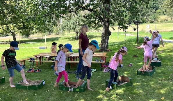 Ein selbstgebauter Barfußpfad lud die Kinder dazu ein, mit den Füßen verschiedene Naturmaterialien wie Heu, Rindenstücke, Sand, Zapfen, Schafwolle, Steine und Äste zu ertasten. Dabei wurde die Wahrnehmung des Tastsinns spielerisch gefördert.
