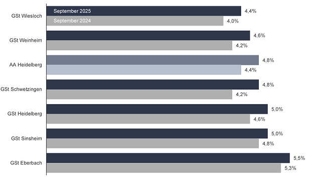Arbeitslosigkeit in Eberbach höher als im September 2024 (Grafik: Arbeitsagentur)(hr) (aa) Im Bereich der Geschäftsstelle Eberbach der Arbeitsagentur Heidelberg hat sich die Arbeitslosigkeit von August auf September 2025 leicht verringert, im Vergleich zum September 2024 ist sie aber gestiegen.