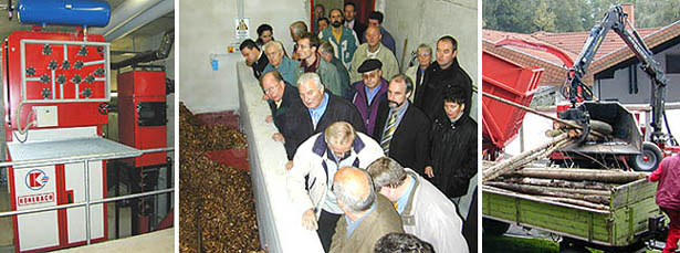 Investitionen sollen sich in 5 Jahren bezahlt gemacht haben Kernstück der neuen Hackschnitzelheizung im Kurzentrum Waldbrunn ist der Holzheizkessel mit Leistung von 600 kW. Auch interessierten sich die Gäste für den Transport der Hackschnitzel in den Kessel bei einem Rundgang durch die Anlage. Der Maschinenring Mosbach führte die Herstellung von Hackschnitzeln vor. (Fotos: Baumgartner)