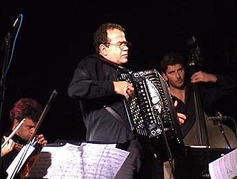 Argentinischer Tango in Vollendung Richard Galliano mit Musikern seiner Band. (Foto:Richter)(hr) (ts) Mit Richard Galliano (Akkordeon und Bandonion) war am Freitag ein weiterer, international gefeierter Star zu Gast bei den Eberbacher Jazz-Tagen. In Begleitung seiner Band, bestehend aus zwei Violinen, Viola, Violoncello, Kontrabass und Klavier, verwandelte Galliano die Stadthalle Eberbach für eine gute Stunde in einen argentinischen Tango-Palast. "Piazzolla forever" - der König des Tangos war Namensgeber für einen Konzertabend voller hin- und mitreißend dargebotener Musik.