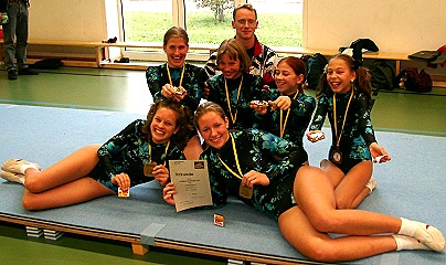 Zweite Mannschaft zeigte sich von ihrer besten Seite (V.l.)vorn: Natascha Weiß, Meike Walter; Mitte: Nicole Beldermann, Vanessa Reubold, Anna Kappes, Anna-Lena Teller; hinten: Janek Lange (Trainer).(Foto:privat)(tw) (jl) Am Sonntag, 13.Oktober, traten die Turnerinnen der Gauklasse zu ihrem Endkampf der Ligasaison 2002 an. Bei dem von der KuSG Leimen ausgerichteten Wettkampf zeigten sich die Mädchen der zweiten Mannschaft des TVE von ihrer besten Seite. Schon an den ersten beiden Geräten, Sprung und Barren, legten sie sich mächtig ins Zeug und sicherten sich einen Vorsprung von über 6 Punkten vor dem Viertplatziertem (SG Tairnbach). Der Rückstand von nur wenigen Zehnteln zum Zweitplatziertem, TV Horrenberg/Balzfeld, konnte am Boden durch leichte Unsicherheiten leider nicht verringert werden. Aber am Schwebebalken gaben die jungen Damen noch mal alles und erkämpften sich den zweiten Platz hinter der KuSG Leimen.