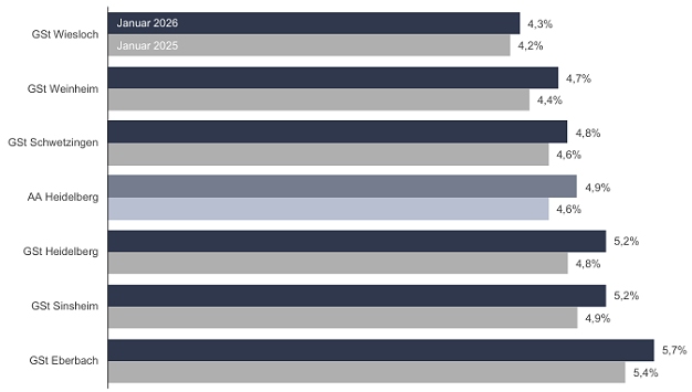 Arbeitslosigkeit klettert weiter (Grafik: Bundesagentur für Arbeit)(hr) (aa) Laut der Bundesagentur für Arbeit lag im Bezirk der Geschäftsstelle Eberbach die Arbeitslosigkeit im Januar 2026 weiterhin an der Spitze aller Geschäftsstellen im Heidelberger Bereich und um 0,8 Prozent höher als der Durchschnitt.