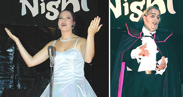 Einmaliges künstlerisches Ereignis in Waldbrunn Eine fantastische Musical-Night erlebte in Waldbrunn ein restlos begeistertes Publikum, bei dem Sonja Westermann - im Bild als Evita Peron vom Musical Evita - und Wolfgang Rick - im Bild als Graf Krolok vom Musical "Tanz der Vampire" - Glanzlichter setzten. (Fotos:Baumgartner)(tb) Solch ein musikalisches Ereignis hatte man in Waldbrunn wohl noch nicht erlebt. Rund 380 Musical-Fans strömten gestern in die bis auf den letzten Platz besetzte Turnhalle an der Winterhauch-Schule Waldbrunn. Rund 60 Besucher mussten sogar außen vor bleiben. Hier luden ausgebildete Künstler aus der Region und die Winterhauchschule zu einer Musical-Night ein. Insbesondere auf Sonja Westermann war das Publikum gespannt. Sie ist eine ehemalige Schülerin der Winterhauchschule und absolviert zur Zeit eine Ausbildung zur klassischen Sopranistin. Begleitet wurde sie von Wolfgang Rick, mit dem sie schon seit drei Jahren als eingespieltes Team auf der Bühne steht und dessen Sohn Benjamin, der eine Ausbildung zum Bariton macht. Beide kommen aus Gundelsheim. Für die Künstler selbst, die meist auf größeren Bühnen stehen, war dieser Auftritt ebenfalls ein besonderes Ereignis, weil selten sich so viele Kinder im Publikum befinden. Neben einem bunten Strauß aus vielen bekannten Songs der Musicals "Cats", "Phantom der Oper", "Jekyll & Hide", "Mozart", "Elisabeth", "Miss Saigon" oder "Tanz der Vampire" wurden dem schon vom Gesang her restlos begeisterten Publikum auch bezaubernde Choreografien und tolle, auf die jeweiligen Musicals abgestimmte Kostüme geboten. Auch die Künstler hatten sich auf diesen Abend gefreut, weil man nun auch einmal im Heimatort von Sonja Westermann auftreten konnte.
