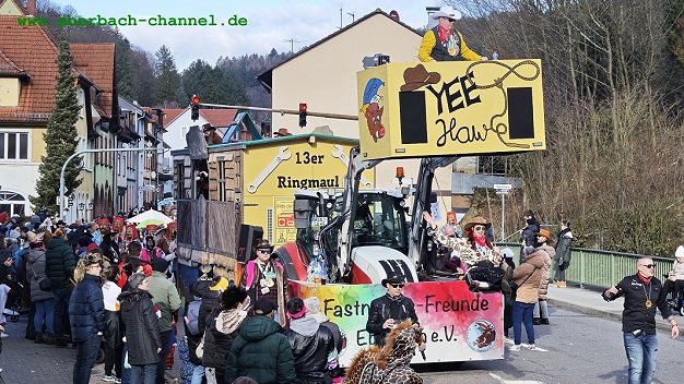 Knapp 80 Zugnummern hatte Röderer vergeben. Die KG Kuckuck selbst und die beiden weiteren Eberbacher Fastnachtsvereine Club Eulenspiegel und KG Urmel waren jeweils mit mehreren Gruppen und Wagen vertreten, außerdem die CG Hirschhorner Ritter, die Neckargemünder Karnevalgesellschaft, die “KaGe Mudemer Wassersucher” aus Mudau und der Wiesenbacher Carnevalclub “Schisslhocker”. Weitere Initiativen aus Eberbach und dem Umland waren vertreten, teils mit aufwändig gefertigten Motivwagen, wie die Karnevalfreunde Haidebow mit einer fahrenden Baustelle, die Rasselbande Eberbach als Retter des Stadtsäckels und die Fastnachtsfreunde Eberbach mit einem rollenden Westernsaloon. Die “Wilde 13” aus Brombach hatte ein Flugzeugcockpit im Schlepptau, das Äppelwoiteam Heddesbach eine große “Polarexpress”-Lokomotive, Spriti und seine Freunde einen “Top-Gun”-Düsenjäger auf dem Dach, die “Wilden aus dem Ittertal” präsentieren ihre Unterwasserwelt, und die Hirschhorner Hexen schwangen ihre Besen. Mit dabei waren auch der diesjährige Abi-Jahrgang des Hohenstaufen-Gymnasiums, der MGV Igelsbach, die “Wimmersbacher Ratze”, die “Linnischer”, die Handballgesellschaft Eberbach, die Fastnachtsfreunde Waldkatzenbach und weitere private Gruppen. Für Live-Musik neben den Stimmungshits aus der Konserve sorgten der Fanfarenzug Eberbach, die “Ghost-Guggs” aus Sinsheim und die Krachkapelle aus Mudau.
