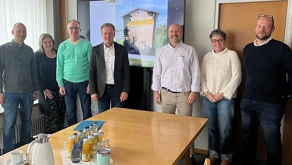 Thonon-les-Bains veröffentlichte dieser Tage ein Foto auf der städtischen Facebookseite, das Landes (3.v.r.) mit Eberbachs Bürgermeister Peter Reichert (4.v.l.) und weiteren Mitarbeitenden der Stadtverwaltung sowie Stadtrat Georg Hellmuth (rechts) im Eberbacher Rathaus zeigt.