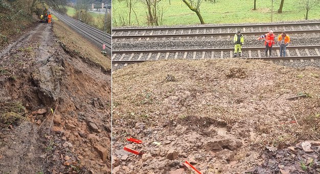 Zwischen Lindach und Eberbach war ein Gleis blockiert (Fotos: privat)(hr) Nach einem Hangrutsch zwischen Eberbach und Lindach kam es seit Dienstagmittag, 24. Februar, zu Beeinträchtigungen im Bahnverkehr