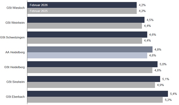 Arbeitslosigkeit leicht zurückgegangen (Grafik: Bundesagentur für Arbeit)(hr) (aa) Laut der Bundesagentur für Arbeit lag im Bezirk der Geschäftsstelle Eberbach die Arbeitslosigkeit auch im Februar 2026 an der Spitze aller Geschäftsstellen im Heidelberger Bereich, trotz leichtem Rückgang.