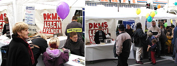 THW und DKMS informierten am Apfeltag (Fotos:Claussen)(jc) Unter dem Motto "Gemeinsam gegen Leukämie" steht ein Aktionstag, den der THW-Förderverein Eberbach e.V. am 26.Oktober gemeinsam mit der Deutschen Knochenmarkspenderdatei (DKMS) durchführt. Von 10 bis 16 Uhr kann man sich beim Technischen Hilfswerk in der Güterbahnhofstraße 11 in die Datei als möglicher Stammzellspender aufnehmen lassen. Dabei wird 5 ml Blut abgenommen, das dann auf seine Gewebemerkmale untersucht wird.