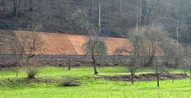 Mit der Wiederherstellung des beschädigten Bahndamms war die Firma Helm aus Neckargerach beauftragt. Der aufgeweichte Böschungsbereich wurde stabilisiert, das Erdreich neu aufgebaut und anschließend dauerhaft gesichert. Zur zusätzlichen Stabilisierung wurde ein spezielles Gewebe eingebaut, das den Böschungsbereich verstärkt und langfristig gegen erneute Erosion oder Rutschungen schützen soll (unser Bild).