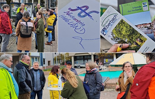 Man kam - wie in jedem Jahr bei den Aprilaktionen des Eberbacher Online-Magazins - in lockerer Runde ins Gespräch mit Anwesenden und Passanten. Aus der Tourist-Info gekommen war auch Bernhard Walter, Leiter der städtischen Abteilung “Märkte - Tourismus - Stadtinformation” (MTS). Er hatte als Entschädigung für das fehlende “Hikeländ”-Infomaterial echte Broschüren rund ums Wandern in und um Eberbach dabei und entwarf aus dem “Neckarsteig”-Stempellogo eine handschriftliche “Hikeländ”-Version (kleines Bild).