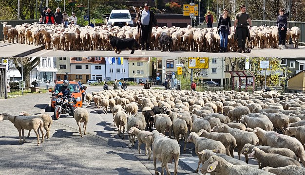 450 Schafe eng an eng auf der Brücke - da ging für den sonstigen Verkehr erstmal gar nichts mehr. Aber nach wenigen Minuten war die Fahrbahn wieder frei, und die Herde hatte den Breitensteinweg erreicht, um zu den Sommerweideplätzen zwischen Scheuerberg und Schollerbuckel zu gelangen.