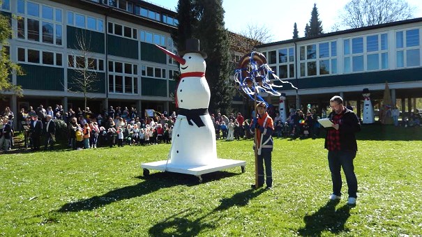 Auf der Wiese der Berufsschule wird ein kleines Programm aufgeführt, und es werden gemeinsam die traditionellen Sommertagslieder gesungen, musikalisch unterstützt von der Katholischen Pfarrkapelle Eberbach. Der Höhepunkt findet dann am Ende des Programms statt: Die symbolische Vertreibung des Winters durch das Verbrennen des großen Schneemanns. Im Anschluss daran erhalten alle teilnehmenden Kinder eine Sommertags-Brezel.