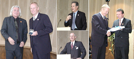 Konzernzentrale der DGF Stoess AG offiziell eingeweiht Linkes Foto: Vorstandsvorsitzender Jörg Siebert (r.) mit Architekt Günter Hermann bei der Schlüsselübergabe. Mitte: Finanzminister Gerhard Stratthaus (o.) und Präsident Ludwig Georg Braun. Rechtes Foto: Bürgermeister Bernhard Martin bei der Überreichung der goldenen Jahresmünze. (Fotos:Claussen)(jc) Heute weihte die DGF Stoess AG mit rund 200 geladenen Gästen aus aller Welt offiziell ihre neue Hauptverwaltung - das Koordinationszentrum für alle internationalen Tätigkeiten der GELITA Gruppe - ein.