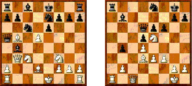 Nur die zweite Mannschaft kann punkten Links: Kritische Stellung bei Wilm (Weiß) nach 11. d5, Rechts: Stellung von Timo Wäsch (Schwarz) nach 25. f6. Es folgt 26. Txa8 Lxa8 27. Dc8.