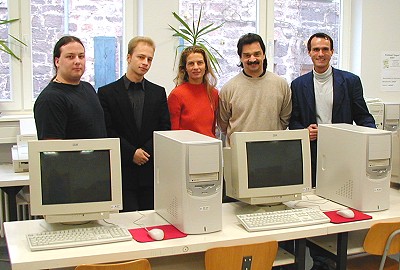 V.l. Alexander Braun und Lucifer Crispian Tonn von der Firma UIB-Consulting, Annette Eiben, EDV-Dozentin VHS, Thomas Wang, Rektor Dr.Weiß-Förderschule und Erol Alexander Weiß, VHS-Leiter. (Foto:Peters)(hr) Da die EDV-Geräte in der Dr.Weiß-Förderschule deutlich veraltet waren, wurden neue Rechner notwendig, um den normalen Kursbetrieb aufrecht erhalten zu können. Die Schule hatte dafür jedoch kein ausreichendes Budget. Deshalb warb die VHS-Leitung um Spenden und wurde fündig: Die Firma Dilo aus Eberbach spendete großzügig 4.000 Euro und ein ungenannter Spender stiftete sechs 17-Zoll-Monitore. Dadurch wurde es möglich, den EDV-Raum in der Dr.Weiß-Förderschule in Eberbach vollkommen neu auszustatten. Die VHS beauftragte in Absprache mit der Dr.Weiß-Förderschule die Firma UIB-Consulting mit den Einrichtungsarbeiten, die diese innerhalb kürzester Zeit erledigte. Mit UIB-Consulting arbeitet die VHS seit Jahren äußerst erfolgreich zusammen. So richtete die Firma bereits den EDV-Raum der VHS in Neckargemünd und die Homepage der VHS ein. Jetzt haben VHS und Schule wieder einen hochmodernen Schulungsraum mit sechs PCs, den sie gemeinsam nutzen können. Zurzeit ist der EDV-Raum noch im Erdgeschoss des Neubaus provisorisch untergebracht. Im Januar soll er in einen Raum im Obergeschoss umziehen. Alle Kurse der VHS sind voll ausgelastet. Um die große Nachfrage zu bewältigen, richtet die VHS ständig Zusatzkurse ein. Ab dem nächsten Frühjahrsemester werden auch erstmals EDV-Wochenendkurse angeboten. VHS-Kursleiterin Annette Eiben, die Teilnehmenden sowie Lehrer und Schüler der Dr.Weiß-Förderschule freuen sich auf den Unterricht mit modernster Technik.