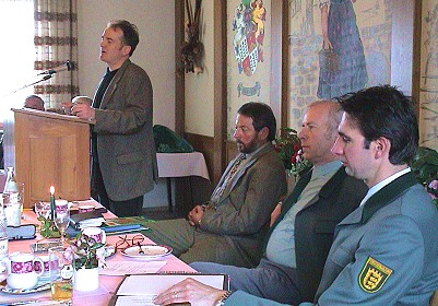 Waldbesitzer brauchen starke Position gegen die Mächtigen der Sägeindustrie Forstkammer-Geschäftsführer Martin Bentele (l.) bei seinem Vortrag. Sitzend v.l. FBG-Vorsitzender Peter Ihrig, Forstamtsleiter Dr.Georg Bungenstab und FBG-Geschäftsführer Matthias Prexl. (Foto:Richter)(hr) Die Jahreshauptversammlung der Forstbetriebsgemeinschaft (FBG) Hoher Odenwald fand gestern im Gasthaus "Linde" in Schollbrunn statt. 270 Waldbesitzer sind in der FBG zusammengeschlossen und vermarkten ihr Holz aus insgesamt 660 ha Wald gemeinsam. So wurden im Jahr 2001 gut 4.000 Festmeter eingeschlagen und verkauft, wie der neue FBG-Geschäftsführer Matthias Prexl vom Staatlichen Forstamt Eberbach mitteilte.