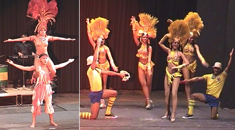 Südamerika-Feeling in der Stadthalle (Fotos:Richter)(hr) Rassige Tänzerinnen und Tänzer und wagemutige Akrobaten waren gestern abend in der Eberbacher Stadthalle zu bewundern. "Brasil Tropical" hieß das Ensemble, das seine Zuschauer aus dem tristen November am Neckar direkt nach Rio de Janeiro und Salvador da Bahia entführte, mitten hinein in eine Welt südamerikanischer Erotik und Mystik. Eingeladen zu dieser "Reise" hatte das Kulturamt der Stadt. Allerdings waren nur rund 120 Besucherinnen und Besucher seinem Ruf gefolgt. Trotzdem sorgten die mitreißenden Rhythmen, die perfekte Körperbeherrschung und die fantasievollen Kostüme für gute Stimmung im Saal.