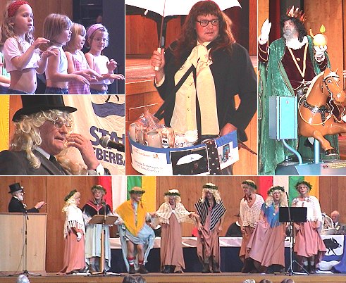 Bürgermeister soll Wissenschaft des Feierns studieren (Fotos:Richter)(hr) Wurde in Eberbach das 775-jährige Stadtjubiläum in diesem Jahr würdig genug gefeiert? Geht es nach den Karnevalisten, so muss diese Frage eindeutig verneint werden. Deshalb lud die Eberbacher Karnevalgesellschaft "Kuckuck" heute zum großen Jubiläums-Festakt in die Stadthalle ein. Nachdem der Vorsitzende des Festkomitees, Ralph Brenneis, der Versammlung den "Hoch-Offiziellen Jubiläums-Ausruf"(HOJA!) beigebracht hatte, gaben sich allerlei illustre Persönlichkeiten der Stadtgeschichte ein Stelldichein: Bürgermeister Dr.John Gustav Weiss lebte in Gestalt von Günter Lipski ebenso wieder auf wie Bürgermeister Christian Bussemer aus dem 19.Jahrhundert (Otto Hildenbrand). Während Ersterer seine Ehrenjungfrauen tanzen ließ (Die Stadtschwalben, Bild unten), ließ Letzterer die Ranzengarde aufmarschieren. Robert Moray (Bild links Mitte) ließ die große 750-Jahr-Feier von 1977 Revue passieren und hatte das Nachtwächter-Duo Franz Emig und Walter Winter mitgebracht. Die aktuellen Feierlichkeiten in diesem Jahr erläuterte Bürgermeister-Stellvertreter Hermann Bussemer. Als Planungskomitee der 800-Jahr-Feier stellte er schon ´mal die "Kuckuckskrümel" vor, die zum Ketchup-Song tanzten (Bild links oben). Mit den verschiedensten Jubiläumsartikeln im Bauchladen kam Wirtschaftsbeauftragte Simone Hurtz alias Elferrat Reinhard Wurm in den Saal und rätselte, warum sie nur auf den ganzen Sachen sitzenbleibe (Bild Mitte).