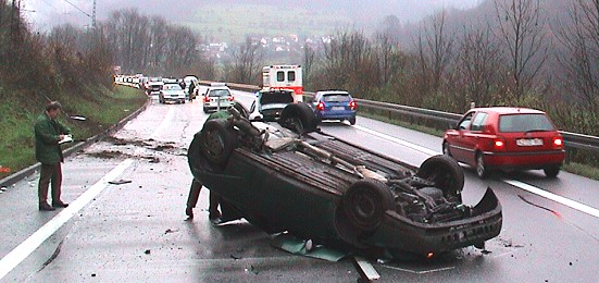 Bei Gegenverkehr überholt - Unfallverursacher türmt (Foto:Richter)(hr) Zeugen sucht die Polizei für einen Unfall, der sich heute nachmittag um 15.35 Uhr auf der B 37 zwischen Eberbach und Hirschhorn ereignete. Bei starkem Verkehr überholte ein in Richtung Eberbach fahrender PKW mehrere Fahrzeuge. Ein entgegen kommender Fiat-Fahrer musste ausweichen, geriet dabei auf den bergseitigen Grünstreifen, überschlug sich und blieb auf dem Dach liegen. Der 30-jährige Fahrer wurde dabei verletzt. Der überholende Unfallverursacher entfernte sich unerlaubt von der Unfallstelle.