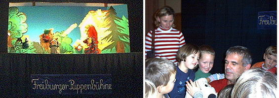 Kasper und die Hexe Klapperzahn zweimal ausverkauft (Fotos:A.Claussen)(jc) (ac) Heute spielte die Freiburger Puppenbühne in zwei ausverkauften Vorstellungen für kleine und große Leute herzerfrischendes, witziges Puppentheater rund um die gesunde Ernährung. Dabei waren neben dem Kasper der Seppel, die Hexe Klapperzahn, die Großmutter und natürlich der Hund Bello. Dieser durfte nach der Vorstellung auch noch ausgiebig gestreichelt werden.