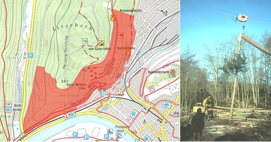 Holzhauerei am Itterberg - Wald wird gesperrt Linkes Bild: Rot markiert der Bereich, in dem die Arbeiten laufen werden. Rechts ein Seilkraneinsatz im Jahr 1997 im Gratzert. (Repro:Stadtförsterei/Foto:Richter)(hr) Wie bereits berichtet, werden demnächst im Stadtwald am Itterberg Holzhauerei-Arbeiten durchgeführt. Die eigentliche Ernte von wertvollem Holz steht dabei aber nicht im Vordergrund. In erster Linie geht es an dem Steilhang zwischen Ittertal und Gammelsbachtal um die Verjüngung des Waldes, also um die Förderung junger Baumpflanzen, die die kommende Waldgeneration bilden sollen. Die Waldverjüngung ist vor allem wichtig, um die ökologischen Funktionen des Waldes langfristig zu sichern, insbesondere den Schutz des Bodens und die Bindung des Niederschlagswassers. Geschieht das nämlich nicht, kann es für die Bewohner der Häuser am Waldrand unangenehme Folgen haben: An einem ungenügend bewaldeten Steilhang ist immer wieder mit herabrollenden Steinen und starkem Hangwasser zu rechnen. Zudem sind in der jüngeren Vergangenheit durch Witterungseinflüsse mehrere alte Bäume umgefallen und haben in bebauten Gebieten Sachschäden verursacht. Gerade solche nicht mehr stabilen, starken Bäume sollen bei den Arbeiten entfernt werden.
