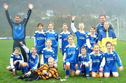 Souverän zum Staffelsieger Stehend von links: Trainer Volker Wäsch, Jannik Ostertag, Sebastian Münch, Kevin D`Andrilli, Artem Stach, Kevin Schüssler, Trainer Wolfram Grimm, Benedikt Held. Kniend von links: Patrick Schüssler, Klaus Körmös, Johannes Eiermann, Hannes Urban, Daniel Zimmermann, Jonas Wagner, Jan Dörfer. Liegend: Patrick Grimm (Foto:privat)(tw) (vw)Im letzten Spiel der Staffel 6 der Qualifikation zur Kreisliga erwarteten die D-Junioren des VfB Eberbach den FC Hirschhorn. In diesem Match wollte man sich den letzten Punkt zur Staffelmeisterschaft sichern. Man war dem Gast aus Hirschhorn von Beginn an klar überlegen und erspielte sich ein deutliches Übergewicht. Es dauerte aber bis zur 17. Spielminute bis die 1:0 Führung durch Johannes Eiermann erzielt werden konnte. Durch dieses Tor spielte man in der verbleibenden Spielzeit viel befreiter auf und münzte die Überlegenheit auch in viele Tor um. In der 23. Minute erzielte der Gast aus Hirschhorn durch ein Eigentor das hochverdiente 2:0. Mit dem Halbzeitpfiff konnte man sogar durch Patrick Schüssler das 3:0 erzielen. Im zweiten Spielabschnitt das gleiche Bild. Die VfB-Jungs bestimmten nach Belieben das Spiel. Schon in der 33. Spielminute konnte Kevin D´Andrilli das 4:0 markieren. Zwei Minuten später schoss Jonas Wagner das 5:0. Die Jungs hatten aber noch Lust auf mehr Tore. So erzielte Hannes Urban in der 41. Minute das 6:0 und nochmals Jonas Wagner, in der 44. Minute, den 7:0 Endstand. Mit diesem souveränen Sieg konnte man sich den ersten Platz in der Qualifikationsgruppe 6 zur Kreisliga sichern. Man erspielte sich in den acht Spielen sechs Siege, ein Unentschieden und eine Niederlage (19 Punkte, bei 27:8 Toren). Dieser Erfolg wurde im Anschluss ausgiebig gefeiert.