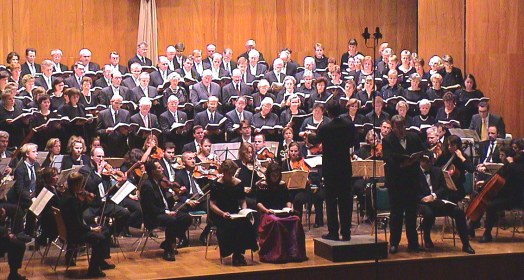 Großes Oratorium zum Kantorei-Jubiläum (Foto:Richter)(hr) Kaum fassen konnte die Bühne in der Stadthalle gestern abend die große Zahl von Sängerinnen und Sängern, Musikern und Solisten. Die Katholische Kantorei feierte mit der glanzvollen Aufführung des Oratoriums "Paulus" von Felix Mendelssohn-Bartholdy ihr 125-jähriges Jubiläum. Unterstützt wurde sie dabei von der Eberbacher Kantorei, dem Heidelberger Kantatenorchester sowie den Gesangs-Solisten Maraile Lichdi, Rüdiger Husemeyer, Markus Flaig und Judith Ritter. Die Leitung hatten die beiden Kantoren Achim Plagge und Godehard Weithoff. Der große Saal war nahezu voll besetzt.