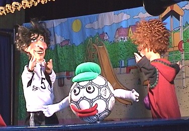 Der Fußballkasper ist milchfit (Foto:C.Richter)(hr) (cr) Auf Einladung des Kulturamtes kam heute das Puppentheater Dieter Kussani mit dem Bühnenstück "Ball im Abseits" in die Stadthalle. Fast 600 Kinder der Eberbacher Kindergärten, der Dr.-Weiss-Grundschule, der Realschule, des Gymnasiums Eberbach und der Förderschule Schwarzach besuchten die beiden kostenlosen Gastspiele. Gesponsert wird die Tournee von der Centralen Marketing-Gesellschaft der deutschen Agrarwirtschaft mbH (CMA) und sie steht unter der Schirmherrschaft des Deutschen Fussball-Bundes (DFB). Der Fußballkaspar im Nationaltrikot, seine Freundin Tina und sein sprechender Ball "Williball" vermittelten den Kindern nicht nur "fußballinternes Wissen" wie Abseits, sondern auch andere wichtige Eigenschaften wie Toleranz, Respekt und Fair Play. Die Kinder waren sofort alle Fußballfans und feuerten den Kasper und seine Freunde eifrig an. Auch beim fetzigen Song "Wir sind fit- unser Zaubertrank ist cool" war Fußballstadionstimmung zu spüren. Am Ende der Veranstaltung erhielten alle Anwesenden einen Milchshake, ein Malheft und eine Ausgabe von "Kaspers Kinder Zeitung". Wer mehr über den Fußballkasper erfahren will findet Infos im Internet.