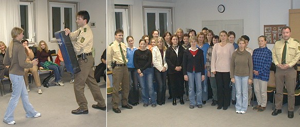 Frauen trainierten Selbstbehauptung Die Teilnehmerinnen mit den Verhaltenstrainern Günter Frey (l.) und Bernd Grimm vom Polizeirevier Eberbach. (Fotos:C.Richter)(hr) 21 Mädchen und Frauen aus Eberbach und Umgebung trainierten beim Polizeirevier Eberbach insgesamt sechs Stunden mit den Einsatz- und Verhaltenstrainern Bernd Grimm und Günter Frey für ihre eigene Sicherheit.