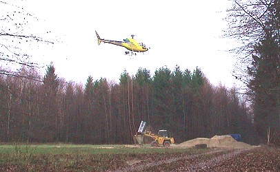 Forstverwaltung düngt wieder Waldflächen (Foto:Richter)(hr) (fa) Seit einigen Tagen kreist ein Hubschrauber über dem Wald zwischen Gaimühle und Friedrichsdorf. An einem Seil unter dem Helikopter hängt ein Behälter, aus dem kalkhaltiges Gesteinsmehl über die Baumwipfel verstreut wird. Insgesamt 380 Hektar Wald werden auf diese Weise gedüngt. Der größte Teil davon gehört dem Land Baden-Württemberg, aber auch rund 65 Hektar Eberbacher Stadtwald sind dabei. Pro Hektar werden vier Tonnen des braunen Materials verteilt - insgesamt also rund 1.500 Tonnen. Das Gesteinsmehl wird per Sattelschlepper an verschiedene Orte im Wald gebracht und dort abgekippt. Ein Radlader nimmt es dann auf und befüllt im Abstand von wenigen Minuten immer wieder den Streubehälter des Hubschraubers, bevor dieser dann wieder zum Abladen davonschwebt.