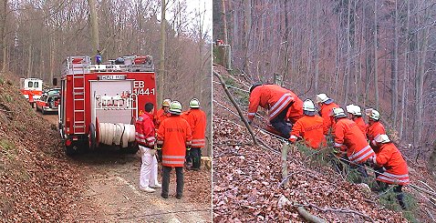 Von Ast erschlagen (Fotos:Richter)(hr) Im Eberbacher Stadtwald am Itterberg verlor heute vormittag ein 33-jähriger Waldarbeiter sein Leben. Ein Kollege von ihm wurde leicht verletzt. Die beiden Mitarbeiter eines österreichischen Holzeinschlagsunternehmens waren mit Baumfällarbeiten am Steilhang oberhalb der Bussemer-Eiche beschäftigt, als aus einer Buchen-Krone ein starker Ast herabfiel und die Waldarbeiter traf.