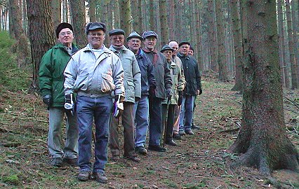 Gammelsbacher Rentner auf historischen Pfaden (Foto:Richter)(hr) Die kürzeste Fußwegverbindung von Gammelsbach nach Eberbach nutzt eine Gammelsbacher Rentner-Gruppe mehrmals im Jahr für Touren ins badische Neckar-Städtchen. Sie verläuft auf Höhe des Gammelsbacher Campingplatzes den Berg hinauf ins Gewann "Sperbersrück" im Eberbacher Stadtwald und weiter auf dem ebenen Althausenweg bis zum Rondell am Itterberg. Von dort aus geht es dann bergab nach Eberbach. Was zwischenzeitlich beinahe in Vergessenheit geraten ist: der Fußweg hat historische Bedeutung. Auf ihm gingen bis in die 60er Jahre des 20.Jahrhunderts täglich die Steinbruch-Arbeiter aus Gammelsbach zu ihrer Arbeit in die Eberbacher Steinbrüche im Gratzert, wo sich heute das Naturdenkmal "Felsennest" befindet.
