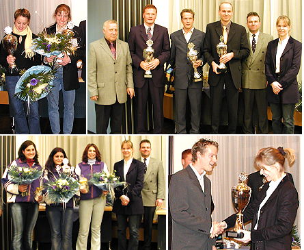 Laura Schmitz, Timo Bracht und Prellballerinnen dieses Jahr vorne Oben v.l.: Laura Schmitz, Angelika Merkel, Dieter Jeitner, Axel Mayer, Timo Bracht, Thomas Hikel, Bernhard Martin und Katja Weber. Unten: A-Jugend-Prellballmannschaft des TV Eberbach sowie Katja Weber bei der Pokalübergabe an Timo Bracht (Fotos:Claussen)(jc) Gestern ehrte die Stadt Eberbach im Ratssaal ihre erfolgreichsten Sportler des zuende gehenden Sportjahres. Bürgermeister Bernhard Martin konnte unter den Gästen wieder zahlreiche Sportfunktionäre und Kommunalpolitiker begrüßen. Als Verstärkung für die Ehrungen hatte Martin in diesem Jahr, neben dem Vorsitzenden des Sportausschusses der Stadt Eberbach, Dieter Jeitner, die elfmalige Sportlerin des Jahres, Katja Weber, geb. Seizinger zur Seite. Für die musikalische Umrahmung sorgte das hochkarätige Saxophon-Quartett "Sax mal anders" der Musikschule Eberbach.