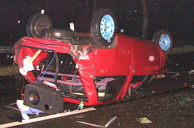 Fahrzeuglenker nur leicht verletzt (Foto:Göller)(jc) Kurz vor dem Ortseingang in Pleutersbach geriet heute gegen 20 Uhr ein 23- jähriger Eberbacher, auf seiner Fahrt aus Richtung Allemühl kommend, mit seinem Pkw ins Schleudern. Dabei prallte er gegen eine Böschung am linken Fahrbahnrand, überschlug sich und flog mit seinem Fahrzeug etwa 20 Meter durch die Luft. Auf der Gegenfahrbahn rammte er dabei einen entgegenkommenden Pkw. Der Unfallverursacher wurde mit leichten Verletzungen im Eberbacher Krankenhaus stationär aufgenommen.