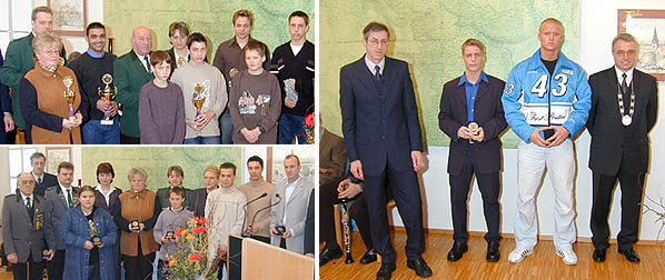Auch deutsche Meister aus Waldbrunn Zahlreiche Sportler wurden beim Neujahrsempfang Waldbrunn mit der bronzenen Ehrenmedaille der Gemeinde Waldbrunn ausgezeichnet (Bild links unten). Das obere Bild zeigt die Mannschaftsführer der geehrten Mannschaften. Auf dem rechten Bild sind die mit der Ehrenmedaille Gold ausgezeichneten Andreas Erdöffy, Sascha Ehrmann, umrahmt vom Sportausschussvorsitzenden Rainer Ihrig und Bürgermeister Klaus Schölch. (Fotos: Baumgartner)