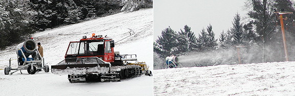 Mit Natur- und Kunstschnee ausreichende Wintersportverhältnisse Am heutigen Vormittag gab es noch viel zu tun um die Schneedecke zu schließen (Fotos:Claussen)(jc) Heute wurde am Beerfelder Skihang noch kräftig gearbeitet um die spärliche Schneedecke mit Schneekanonen und Pistenraupe ausreichend zu schließen. Bereits am Nachmittag konnten dann auch schon die ersten Kunden auf den Brettern den rund 500m hoch gelegenen Hang testen. Morgen ist der Schlepplift ab 13 Uhr in Betrieb. In den kommenden Tagen ist die Anlage von 10 bis 21 Uhr geöffnet, wobei ab 17 Uhr unter Flutlicht gefahren werden kann. Unterhalb der Liftanlage kann am Hang auf rund 10cm Neuschnee gerodelt werden. Loipen sind allerdings nicht gespurt. Informationen unter Tel.: (06068) 930320