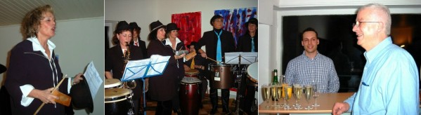 Mensch und Organisation stehen im Mittelpunkt des Konfliktmanagements Jutta Barner- Grüber bei der Begrüßung der zahlreich erschienenen Gäste. Die Eberbacher Musikgruppe "Ramba Zamba" heizte dem Publikum kräftig mit Samba- Rhythmen ein. Rechts im Bild Sebastian und Gerhart Grüber (Fotos: Böhm)(ub) Mit vielen Freunden und Gästen aus nah und fern eröffnete gestern Jutta Barner- Grüber den neuen KPunkt in der Pleutersbacher Straße 32. Zahlreiche Vertreter des öffentlichen Lebens, u.a Bürgermeister-Stellvertreter Hermann Bussemer, waren der Einladung der Mediatorin Barner- Grüber gefolgt und konnten die vom Malerfachbetrieb Markus Hönig neu gestalteten Räume besichtigen. Im jahrelang privat genutzten ehemaligen Café Bracht hat sich Jutta Barner- Grüber zusammen mit ihrer Familie einen Wunsch realisiert. Fast- Schwiegertochter Isabelle Bungert lieferte die Idee zum Umbau. Sebastian, Gerhart Grüber und Jutta Barner- Grüber setzten diese Idee um. Die Eberbacher Band "Ramba Zamba" heizte den Gästen kräftig mit Samba- Rhythmen und afrikanischer Musik ein.
