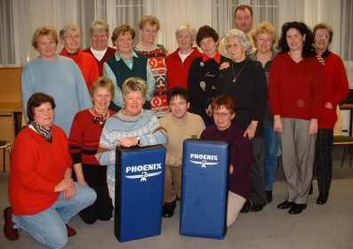 Beginnt ab 45 Jahren in Sachen Sicherheits- und Selbstwertgefühl ein neuer Lebensabschnitt? Die Teilnehmerinnen des Selbstbehauptungstrainings mit den beiden Trainern. (Foto:Weyrauch)(tw) (pre) Nachdem in Amerika dieser Lebensabschnitt, nicht ohne Grund, bereits als "Mastery" (=überlegene-Zeit) bezeichnet wurde, gingen Bernd Grimm und Günther Frey vom Polizeirevier Eberbach in einem jetzt durchgeführten Anti-Gewalt-Verhaltenstraining für Damen dieser Frage nach. Eigentlich sollte man annehmen, dass im "Mastery" die beste Möglichkeit besteht, sein Leben nach den eigenen Vorstellungen zu gestalten. Es stellt sich jedoch für den einen oder anderen die Frage, ob das, was hinter einem liegt, in der gleichen Art und Weise so weitergehen kann. Er oder Sie wird vorsichtiger. Hinzu kann kommen, dass die "Hetzkrankheit" in der heutigen Leistungsgesellschaft erste Tribute fordert. Beeinträchtigungen der körperlichen oder seelischen Gesundheit können das Selbstwertgefühl beeinträchtigen. Plötzlich werden Dinge wahrgenommen, die einem früher nicht so nah gingen. Dabei können gerade Frauen im ganz normen Alltag alle Arten von Gewalt erleben. Wer sich mit Selbstbehauptung ein gutes Gefühl zu sich selbst bewahrt, kann aus einer angebotenen Opferrolle einfach aussteigen. Die beiden Verhaltenstrainer der Polizei kommen mit der Aussage "Selbstverteidigung beginnt im Kopf" immer wieder auf diese Verbindung zurück.