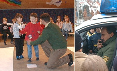 Polizeiaufgebot im Kindergarten Oberkommisar Paul Hotz bei der Darstellung eines Motorradunfalls und Oberkommisar Detlev Bruhs beim Erklären des Polizeiautos. (Fotos:C.Richter)(hr) Im Kindergarten St.Josef in der Waldstraße waren heute Oberkommisar Paul Hotz und Oberkommisar Detlev Bruhs von der Verkehrserziehung Sinsheim zu Gast. Witzig und locker erzählten die beiden Polizisten, die neben den Schulen auch insgesamt 96 Kindergärten betreuen, den Vorschulkindern, wie sie sich im Straßenverkehr verhalten sollen. Aber auch Themen wie Mitfahren in fremden Autos und typisches Aussehen von Verbrechern wurden mit den Kindern lebhaft diskutiert. Natürlich durfte auch die Besichtigung des Polizeiautos nicht fehlen. Zum Schluss gab es für alle Kindergartenkinder einen Zeichentrickfilm über Verhalten im Straßenverkehr sowie Infomaterial.