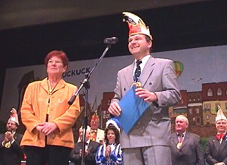 Eberbacher Karnevalorden für langjährige Tanztrainerin Gisela Oriwal bei der Ehrung durch Bürgermeister Bernhard Martin. (Foto:Richter)(hr) Wenn im Karneval die Gardemädchen ihre Beine wirbeln lassen, dann fiebert eine Frau am Bühnenrand immer ganz besonders mit. Gisela Oriwal ist die Trainerin der Tanzgarden bei der Karnevalgesellschaft Kuckuck, und das nun schon seit 25 Jahren. In zahllosen Übungsstunden hat sie schon vielen hundert Mädchen das Einmaleins des Marsch-, Garde- und Schautanzens beigebracht und bei der Kostümausstattung mitgewirkt. Dabei versteht sie es immer wieder, ihre eigene Begeisterung für das Tanzen auf ihre Schützlinge zu übertragen - eine Begeisterung, die auch beim Publikum ankommt, wenn die Mädchen ihr Können zeigen. Eindrucksvoll war das gestern abend bei der Prunksitzung der KG Kuckuck wieder zu erleben. Gisela Oriwals langjähriges Engagement für das karnevalistische Brauchtum wurde dann gestern auch im Rahmen der närrischen Sitzung gewürdigt. Aus den Händen von Bürgermeister Bernhard Martin nahm die "Herrin über 140 Mädchenbeine" den offiziellen Karnevalorden der Stadt Eberbach, den "Lachenden Eber", in Empfang.