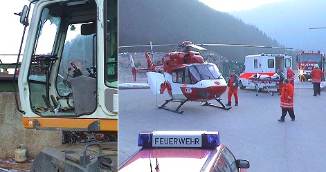 Gasflasche trifft Baggerführer am Kopf (Fotos:Richter)(hr) Schwere Verletzungen erlitt ein Baggerführer heute morgen bei einem Arbeitsunfall auf dem Gelände der Firma INAST im Ittertal. Der Mann war mit dem Umladen von Schrott beschäftigt, als eine Gasflasche, die er mit dem Baggerarm eigentlich wegwerfen wollte, in die Kabine der Maschine zurückschlug. Die Gasflasche zertrümmerte die Frontscheibe und traf den Baggerführer an Kopf und Oberkörper. Die Verletzungen waren so schwer, dass der 42-Jährige nach der Erstversorgung durch den Eberbacher Notarzt per Rettungshubschrauber in die Klinik transportiert werden musste.