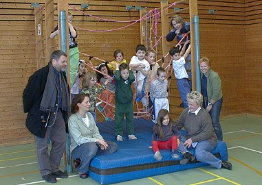 Ein weiteres Angebot ist die Kooperation Schule/Kindergarten. Diese Kooperation ist seit August 2002 gesetzlich vorgeschrieben, wobei hierfür keine Unterrichtsstunden zusätzlich freigestellt werden. Zurzeit arbeitet Karin Müller mit dem Kindergarten St. Elisabeth zusammen, der von Ulrike Kraus geleitet wird. Insgesamt 30 Kinder, die in diesem Jahr eingeschult werden, werden 14-tägig in Wahrnehmungs- und Konzentrationsförderung unterrichtet. Einmal wöchentlich kommt ein Teil dieser Gruppe in die Mehrzweckhalle, um in einer "Sportlandschaft" zu toben und zu turnen. Psychomotorik nennt sich dieser Unterricht. Die Kinder können hier ohne Leistungsdruck die Geräte ausprobieren und lernen unter anderem Selbstvertrauen. Und außer dass es Spaß macht, sind Erfolge schnell sichtbar, so Müller und Kraus.