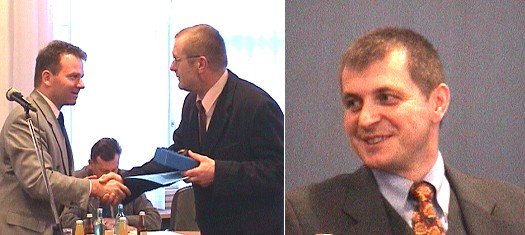 Wechsel in den Ratsreihen bei den Freien Wählern Paul Sillak empfängt von Bürgermeister Bernhard Martin (l.) die Abschiedsurkunde und ein Präsent. Rechts der neue Stadtrat Peter Wessely. (Fotos:Richter)(hr) Nach rund dreijähriger ehrenamtlicher Tätigkeit als Stadtrat musste Paul Sillak jetzt aus gesundheitlichen Gründen sein Mandat zurückgeben. Der Freie Wähler war am 24.Oktober 1999 in den Eberbacher Gemeinderat gewählt worden und gehörte seitdem unter anderem auch dem Bauausschuss und dem Werksausschuss an. Bereits seit 1994 war er beratendes Mitglied im Bauausschuss gewesen. FWV-Fraktionschef Dr.Gerhard Brunn bescheinigte dem scheidenden Ratskollegen in der heutigen Gemeinderatssitzung großen Sachverstand, vor allem in technischen Fragen, und überreichte ihm ein Weinpräsent.