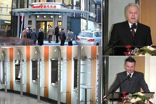 Umgebaute Sparkassen- Hauptstelle eingeweiht Neuer Eingangsbereich, Blick in die 24 Stunden- Zone. Michael Quiring (oben) und Bernhard Martin bei ihren Ansprachen. (Fotos:Claussen)(jc) Der Hauptstellenumbau der Sparkasse Neckartal-Odenwald in Eberbach ist abgeschlossen. Heute fand in der modernisierten Kundenhalle die offizielle Einweihungsfeier statt. Sparkassendirektor Michael Quiring erläuterte in einer Ansprache die Beweggründe für den nun abgeschlossenen Umbau, der bereits bei der Fusion mit der Sparkasse Mosbach im Jahre 1999 vereinbart worden war. Man sei vor allem der verstärkten Nachfrage nach Selbstbedienungsgeräten sowie dem gleichzeitigen Anspruch nach diskreter und fachkundiger Beratung nachgekommen.