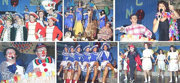Minneburghalle kochte bei Riesenprogramm der Gericher Stromer Die Turnhalle der Minneburg-Schule kochte bei der Prunksitzung der Gericher Stromer. Unsere Fotos zeigen ein paar Highlights der Sitzung. Obere Reihe v.l. den Prolog des großen Prinzenpaares, Prinzessin Nadja und Thomas vom Hohen Odenwald mit dem kleines Prinzenpaar Alisa und Dennis, den Showtanz der großen Garde, sowie das Streitgespräch zwischen Richard Langer und Christina Kessler. Die untere Reihe zeigt v.l. Schorsch und Seppel, die mittlere Garde und die Teenies bei ihrem Showtanz. (Fotos:Baumgartner)(tb) Donnernd schallte gestern das "Gerisch Helau" durch die bis auf den letzten Platz gefüllte Turnhalle der Minneburg-Schule, als der Neckargeracher Carnevals-Verein "Gericher Stromer" seine zweite Prunksitzung der Kampagne 2002/2003 veranstaltete. Traditionell stehen in "Gerisch" bei der Prunksitzung durchweg einheimische Narren auf der närrischen Bühne. Unter der Regie von Präsident Anton Stark, dem Kinderprinzenpaar Alisa und Dennis und dem großen Prinzenpaar, Prinzessin Nadja und Thomas vom Hohen Odenwald brannte man ein Feuerwerk närrischen Frohsinns ab.