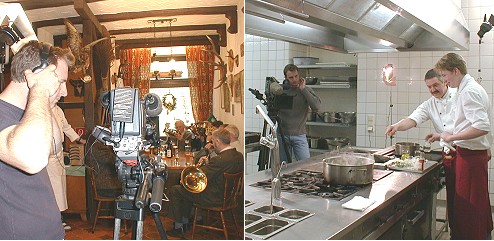 Kulturelle und kulinarische Highlights Eberbachs im Fernsehen Kameramann Stefan Bank (l.) im Gasthaus "Kühler Krug" mit den Eberbacher Jagdhornbläsern und im Hotel "Karpfen", wo Ulrich Berner und Andreas Malkow "Karpfen Blau" kredenzten. (Fotos:C.Richter)(hr) Eine "Schlemmerreise" im Neckartal unternimmt derzeit Kameramann Stefan Bank von der Produktionsfirma "Halo Film". Gestern und heute filmte er an verschiedenen Orten in Eberbach Sehenswürdigkeiten und gastro-kulturelle Events, z.B. im Viktoria Café und im Hotel "Altes Badhaus". Heute baute Bank seine Kamera unter anderem im Hotel "Karpfen", im Gasthaus "Kühler Krug" und im Küfereimuseum auf.