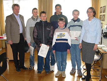 Schulleiter Günter Wiedemer und die durchführende Erdkundelehrerin Jutta Hertlein gratuliertem dem Schulsieger und den Klassensiegern zu ihren Leistungen. Um das Interesse und Wissen des Schulsiegers zu belohnen aber auch weiterhin zu fördern, überreichte Schulleiter Wiedemer einen entsprechend motivierenden Preis: Einen telefonbuchdicken Fach-Bildband "Die Erde".