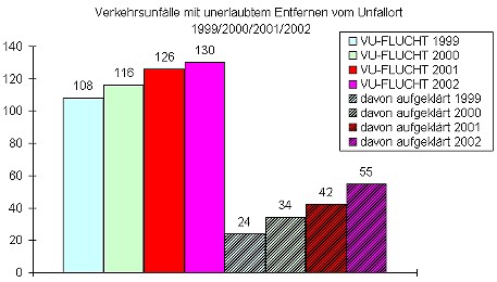 Zahl der Verkehrsunfälle deutlich angestiegen Gegen Verkehrsunfallflucht will die Polizei verstärkt vorgehen. (Grafik:Polizei)(hr) (cr) Insgesamt 473 Verkehrsunfälle beschäftigten die Beamten des Polizeireviers Eberbach im Jahr 2002. Das sind 19 Prozent mehr als im Vorjahr. Gar um 34 Prozent zugenommen haben die Unfälle mit Personenschaden von 58 im Jahr 2001 auf 78. Drei dieser Unfälle hatten sogar tödliche Folgen: Ein 75-jähriger Fußgänger wurde an einem Bahnübergang vom Zug erfasst, ein 33-jähriger BMW-Fahrer starb bei einem Überschlag in Heddesbach und ein 16-Jähriger raste mit seinem Leichtkraftrad auf der L 524 frontal gegen ein Auto. Der bei allen Unfällen im Jahr 2002 entstandene Sachschaden beläuft sich auf über 782.000 Euro - eine Rekordsumme der letzten fünf Jahre.